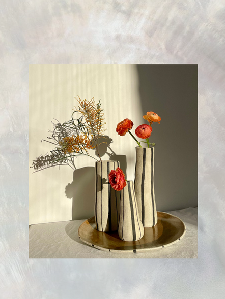 Defined by bold stripes, bright colours, earthy clay textures, playful seashell motifs and warm metallic glazes and lustres